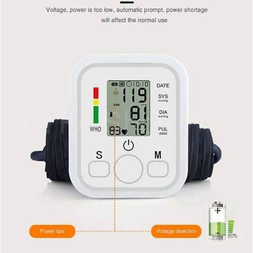 يتميز الجهاز بشاشة LCD كبيرة وواضحة، تعرض ضغط الدم الانقباضي والانبساطي، ومعدل نبضات القلب، مع مؤشر WHO الذي يوضح حالة الضغط (طبيعي، مرتفع، منخفض). يتم تركيبه بسهولة على الذراع، ويعمل بزر واحد فقط، ما يجعله مثاليًا لكل أفراد الأسرة.